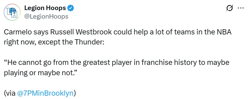 北京时间10月12日,9届全明星后卫威少仍未与任何NBA球队签约红盘策略,前队友安东尼在播客节目上谈及此事,他很同情威少的处境,也感同身受。