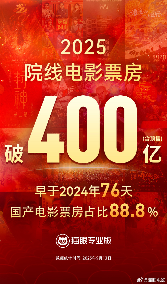 据猫眼专业版数据,2025年9月13日13时05分,2025年度票房(含预售)破400亿,早于2024年76天到达,国产电影票房占比超88.8%,年度票房榜前十均为国产电影!